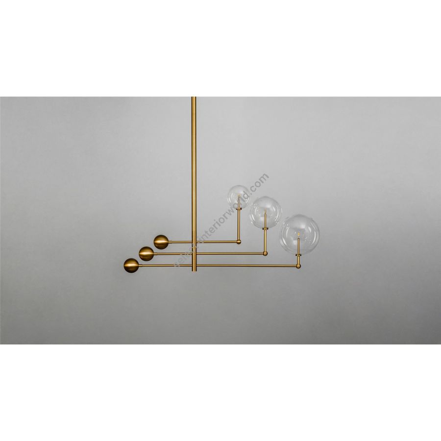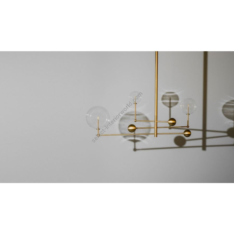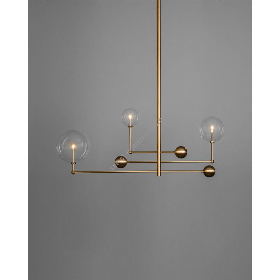 Three illuminated glass globes orbit a central gravitational axis. Rotating brass arms evoke the mechanical grace of the astronomical orrery. A celestial piece where precision meets elegance.