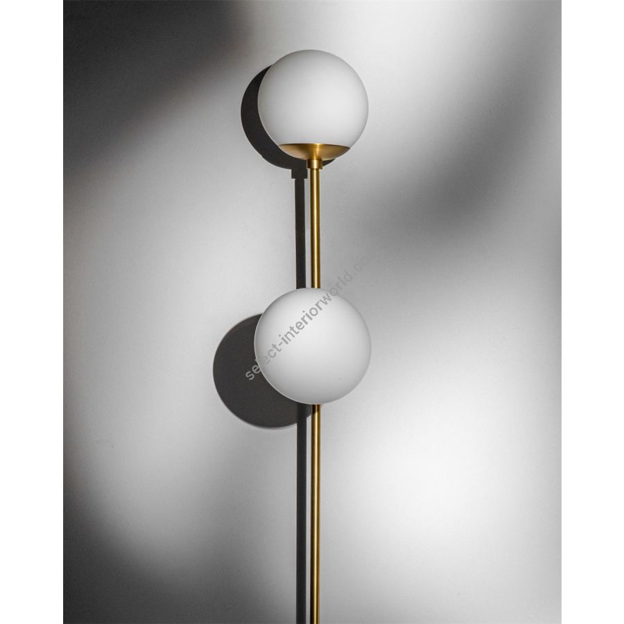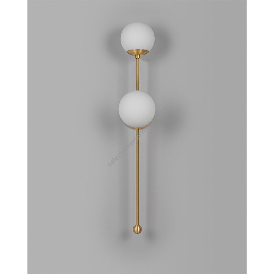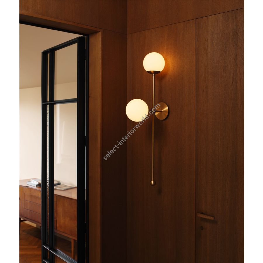 A pair of globes sit at right angles upon a brass sconce. Inspired by the design of classic brasserie lights, the minimalist composition allows the quality of the glass - available in three signature finishes - to shine.
