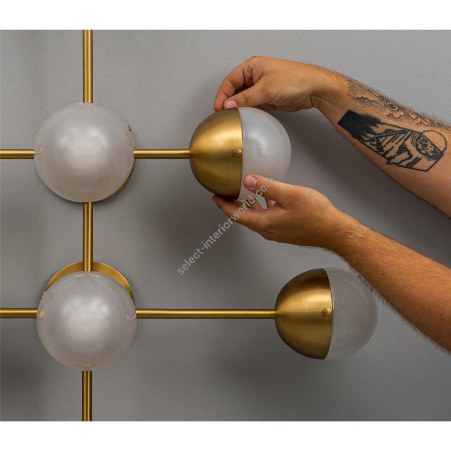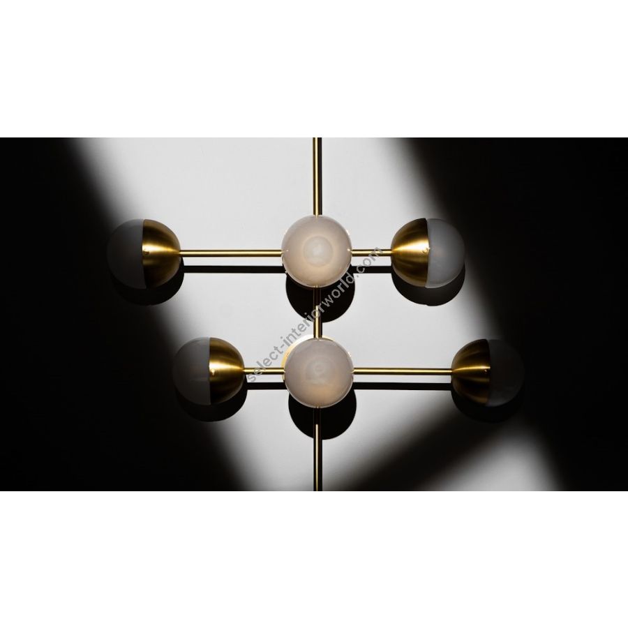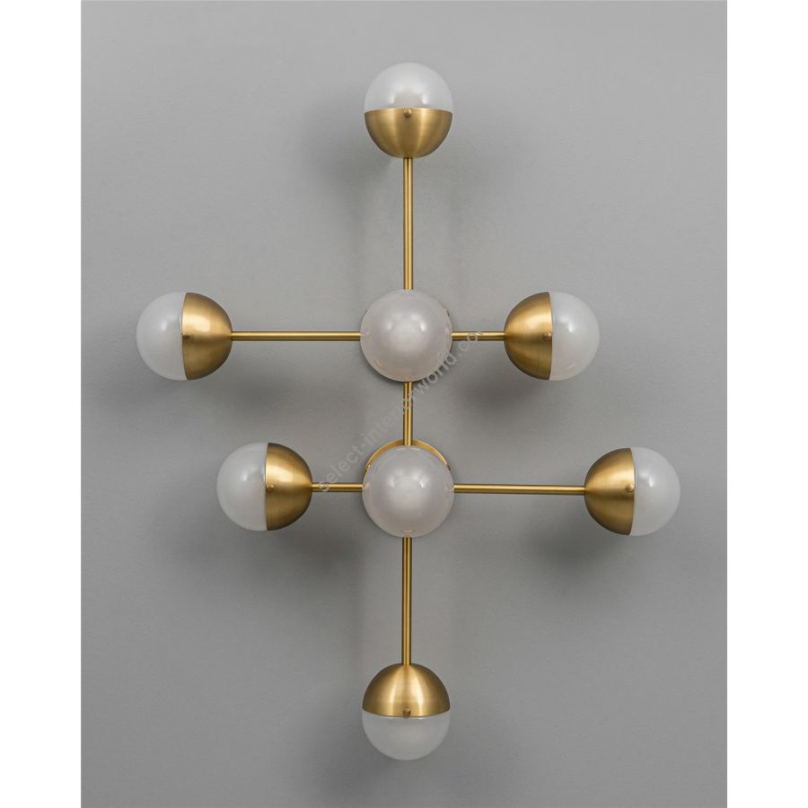 Recalling the basic elements of matter, this wall-mounted molecular model is composed of brass connections. The flush mount base gives this lamp special adaptability, a wall-mounted statement, or a compact chandelier.
