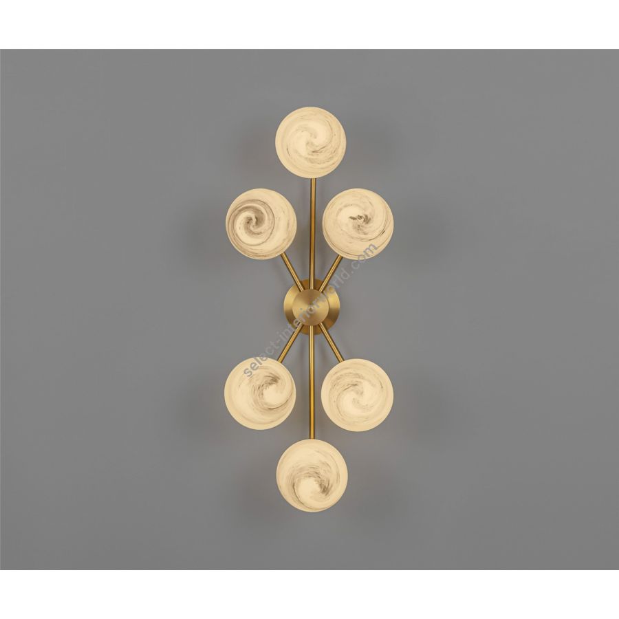This arrangement of lights explodes into a brass and glass sunburst. A constellation of illuminated globes linked to a central axis creates a space-defining sculptural impression. The flush mount base gives this lamp special adaptability, a wall-mounted statement, or a compact chandelier.