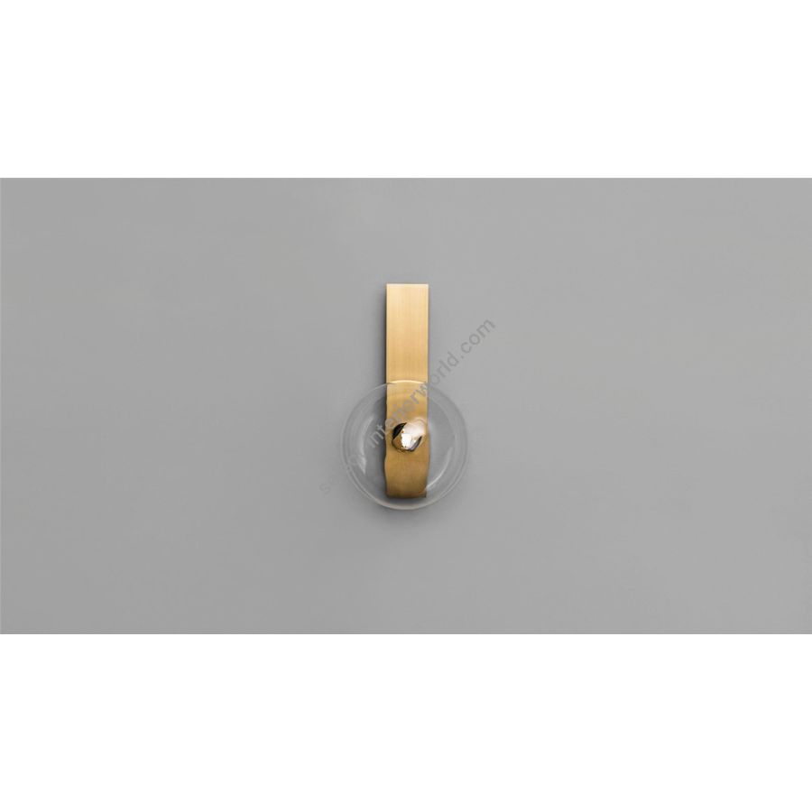A single glass bubble alights upon a slender rectangle of brass for an essential design. Inspired by the sober compositions of mid-20th century Norwegian artist Ragnhild Keyser, the unique surface curvature of the mouth-blown globe lends a subtle optical distortion to minimalist lines.
