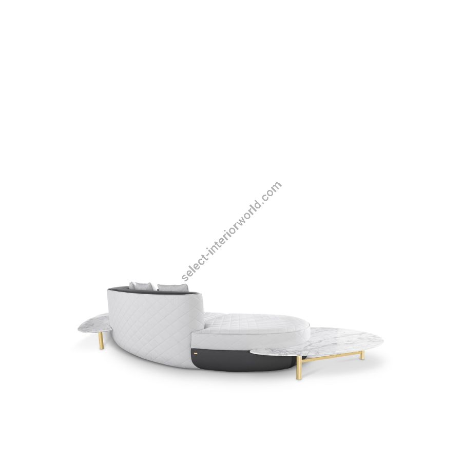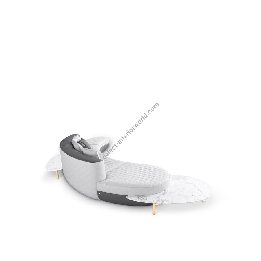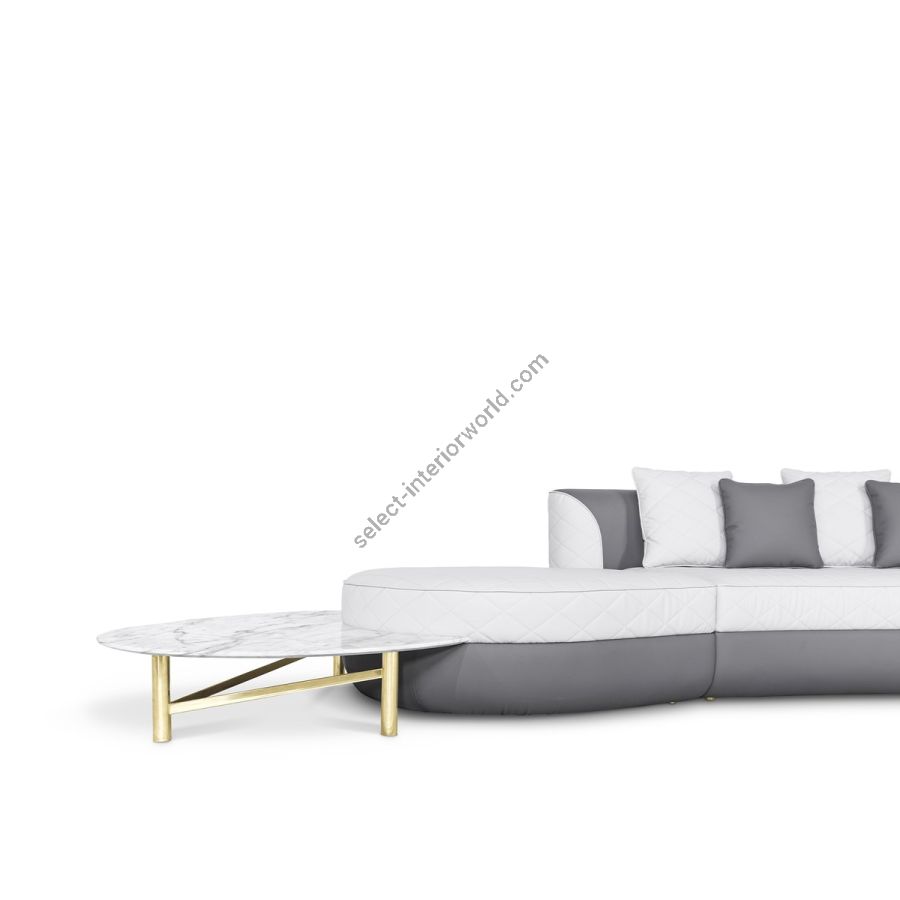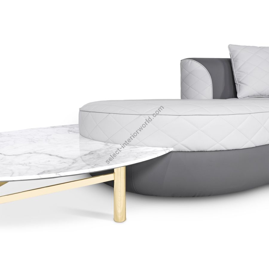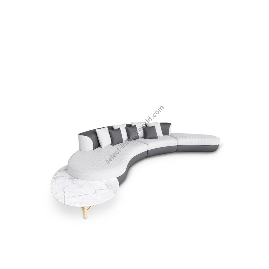 The Senzu Sofa epitomizes comfort, functionality, and luxury with its round form, neutral color scheme, and leather upholstery. It features an integrated side table with a Carrara marble top and stainless steel base, adding a new dimension to your living room decor.