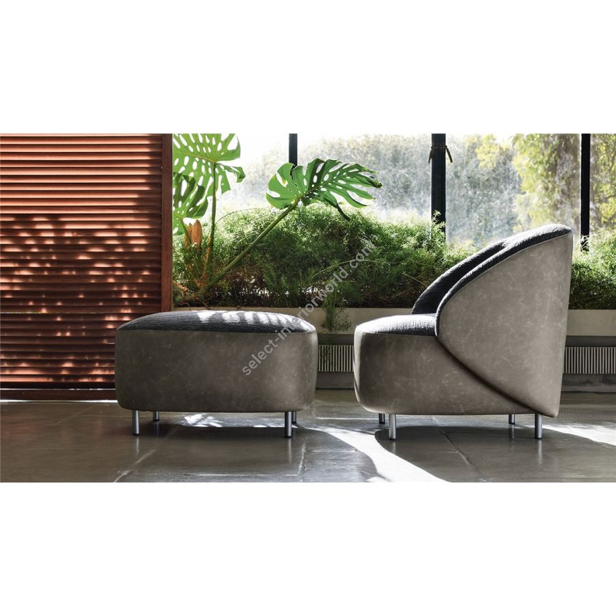 Armchair structure in poplar plywood. Padding in polyurethane foam with different densities. Upholstered in fabric, leather or eco-leather. Metal feet.