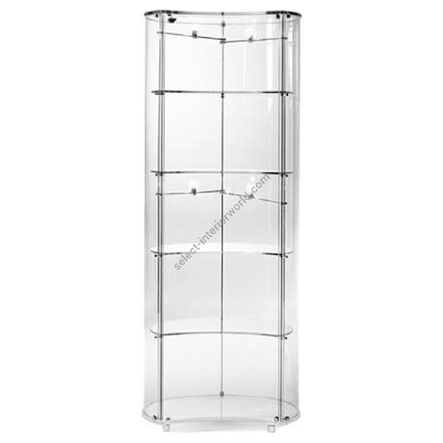 Vitrine in curved glass with base in white or black lacquered glass and top in transparent glass. Available also with wooden base and top in walnut, wenge finish, shiny or matt black or white lacquered, or silver or gold leaf. Door with lock, adjustable shelves and optional lighting system.