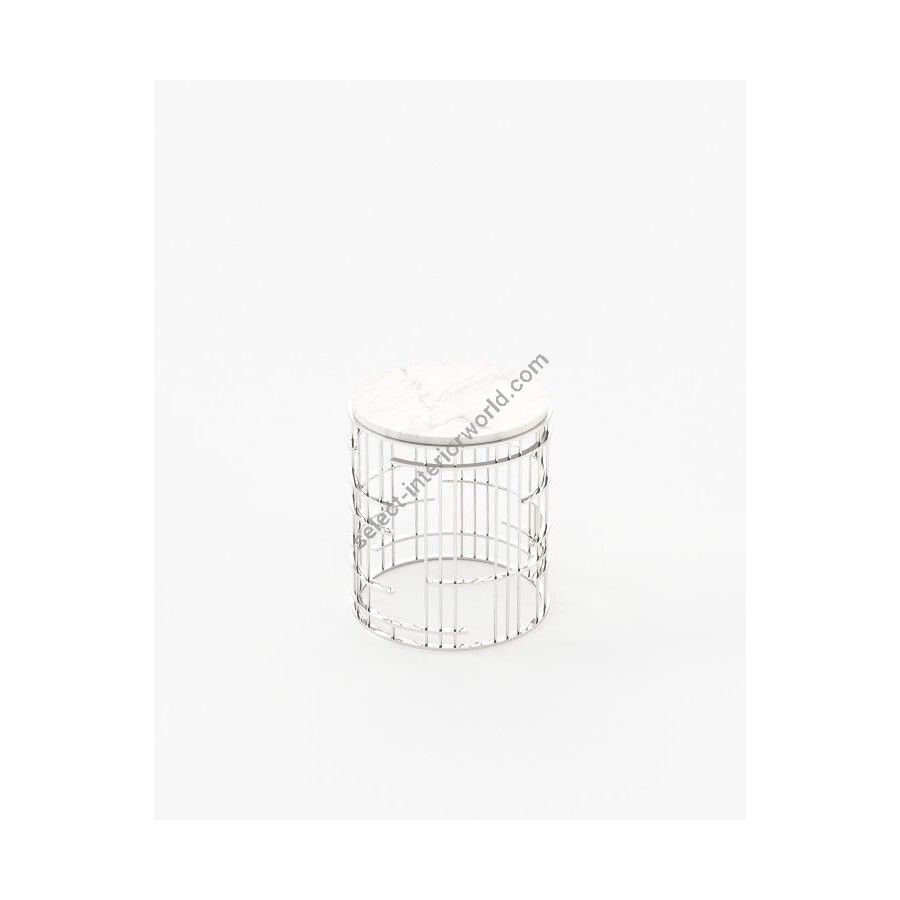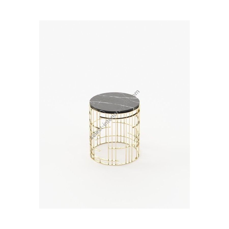 The Mercy side table is a geometric masterpiece, featuring a round tabletop, metallic structure, and an asymmetrical line body.