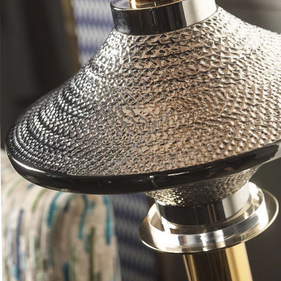 A very special floor lamp composed of a central part in majolica engraved by hand and platinum plated, the whole structure is in gilded brass and nickel with plexiglass inserts turned by hand. The lampshade that is the most particular part of this lamp is composed of an outer lampshade in nickel brass with plexiglas plates and the inner lampshade is in gold lamé fabric. Modern taste but it’s also placed in classic environments.