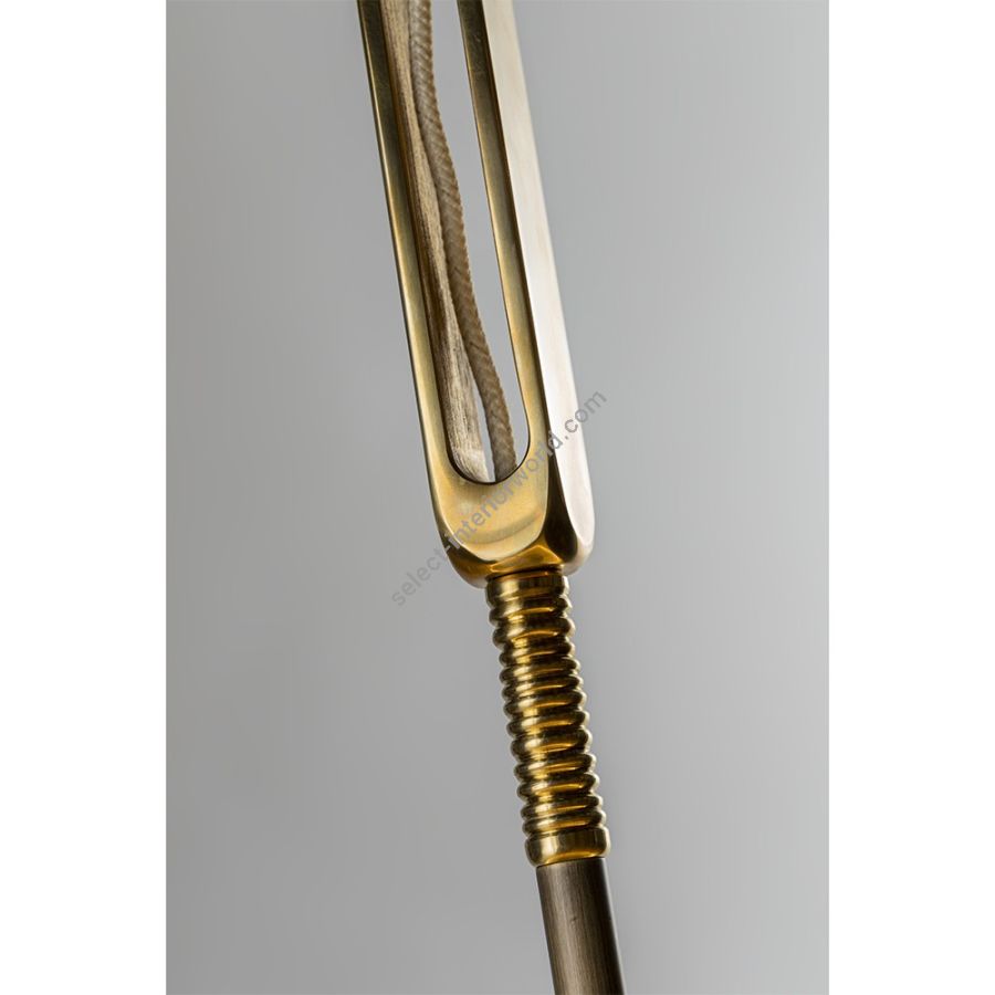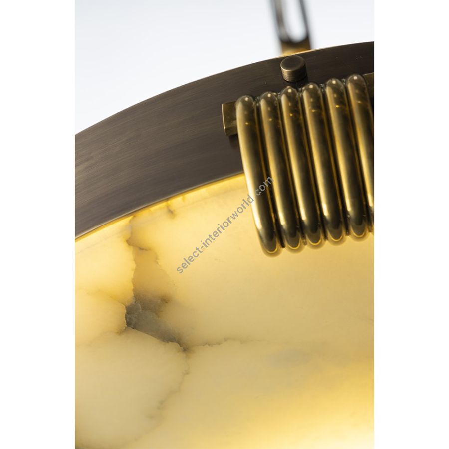 This chandelier has been made entirely by hand in brass and bronze, consisting of a structure in burnished finish and the parts in cast bronze are in natural finish. The peculiarity of this chandelier is the precious ivory alabaster disk, while on the upper part a plexiglass disk is placed. The chandelier is inspired by elegance and refinement, is suitable for both contemporary and classic environments as well as for living areas and studios, can adorn entrances and corridors. In photo it has a height of 128cm but on request it can be modified