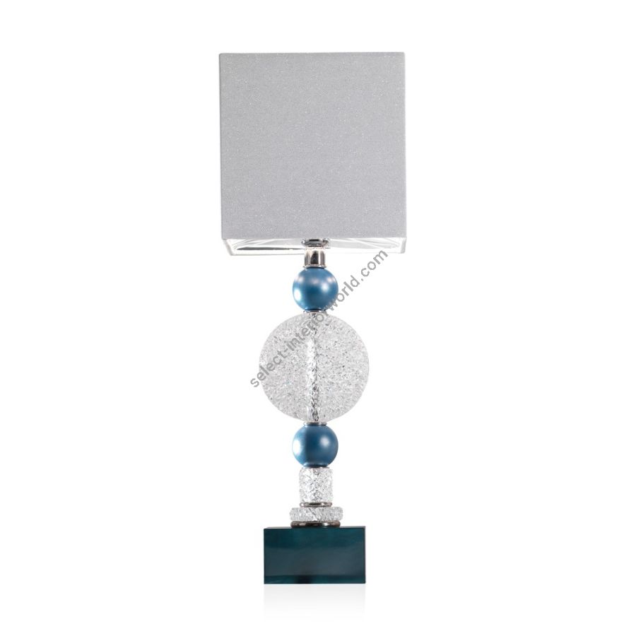 Hand faceted crystal lamp with glazed majolica and chromed brass details. Pearly azure lacquered base. White silk with silver dots lampshade with silver inside.