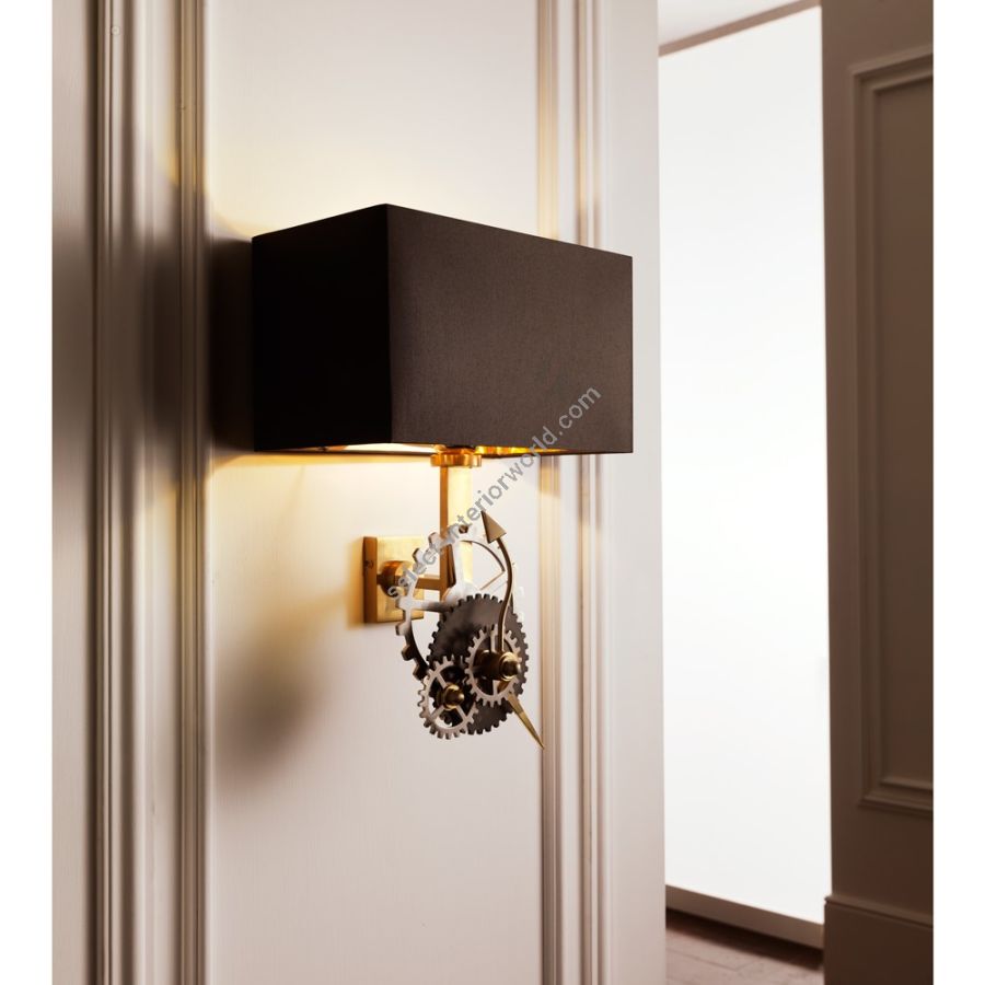 Golden brass wall lamp with iron gearwheels in pewter and brushed chrome finish. Black chintz lampshade with golden inside.