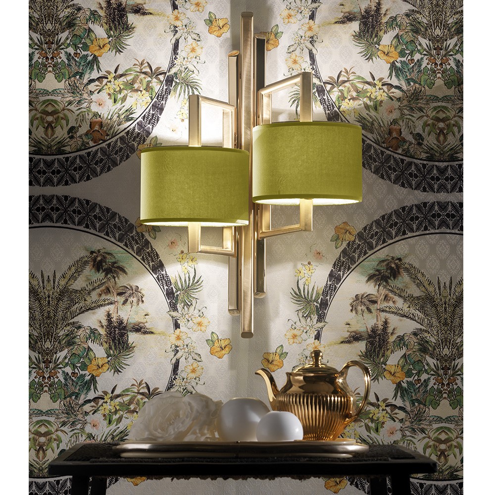 Brass wall lamp with shiny, satin golden finish. Velvet lampshades, also available in silk.