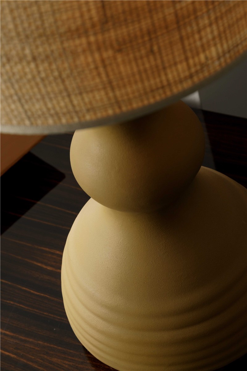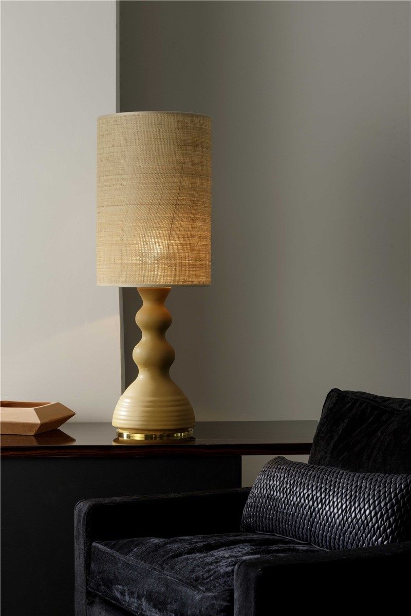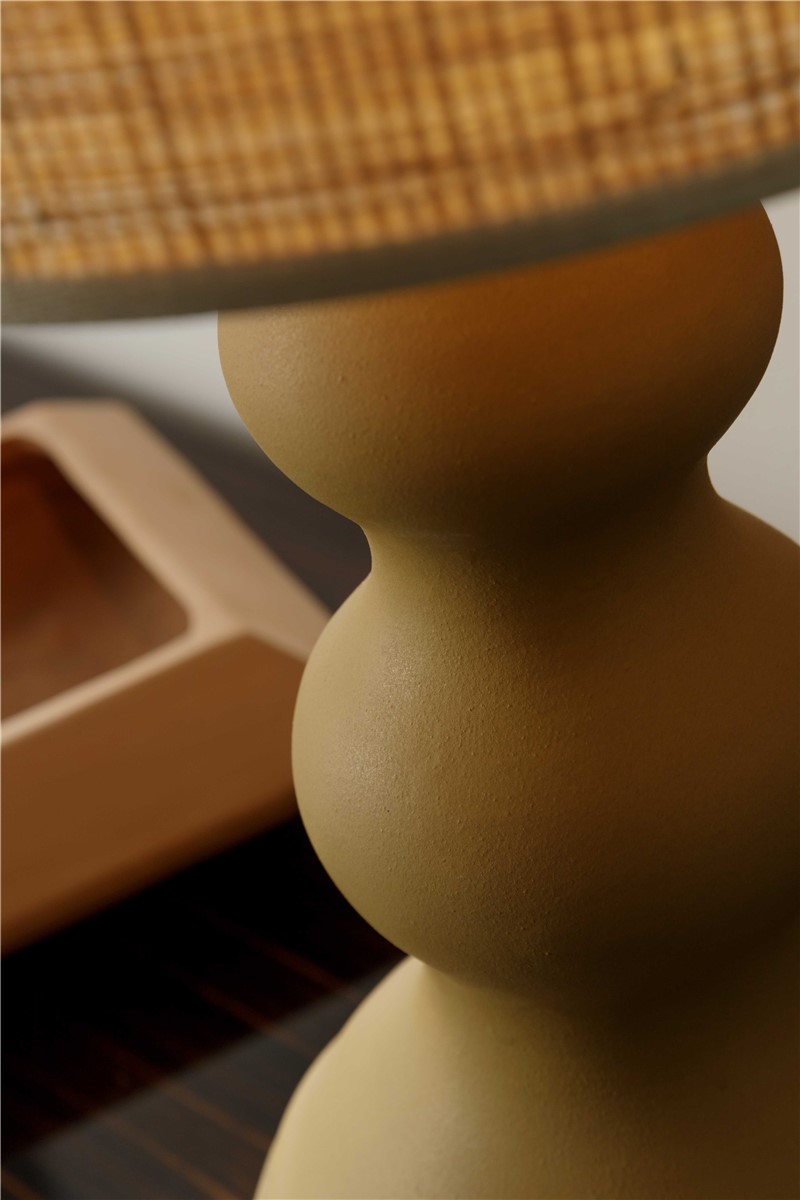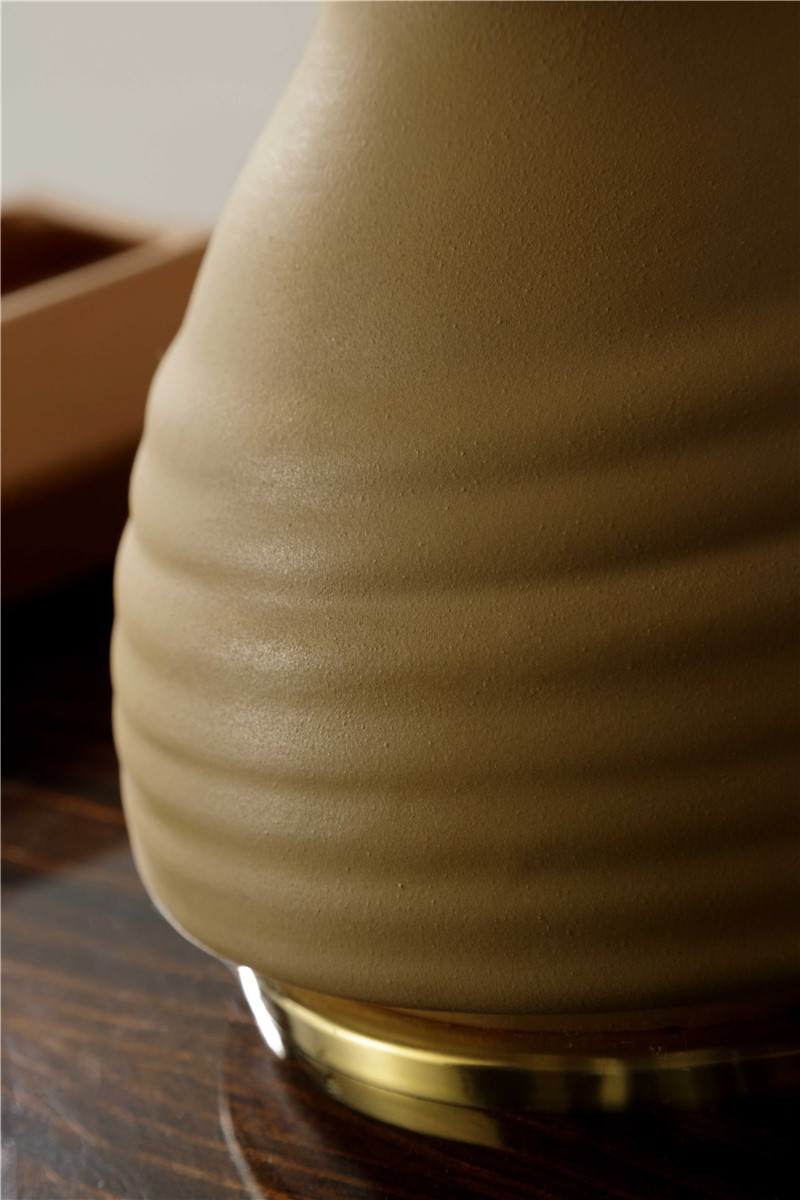 Table lamp in glazed majolica in opaque camel tone with details in natural brass. The lampshade is in natural straw
