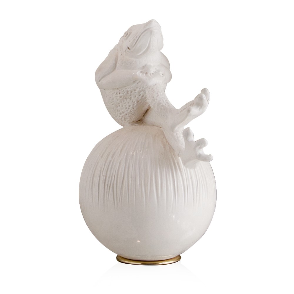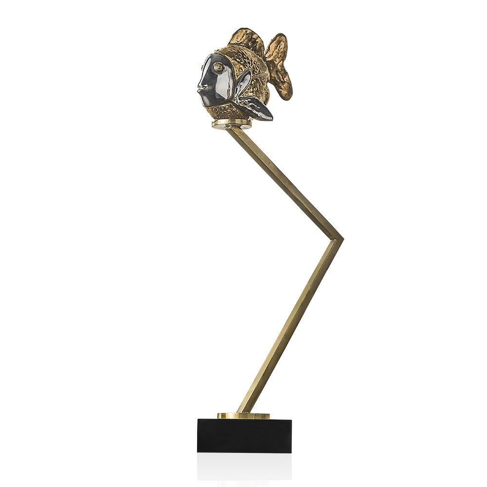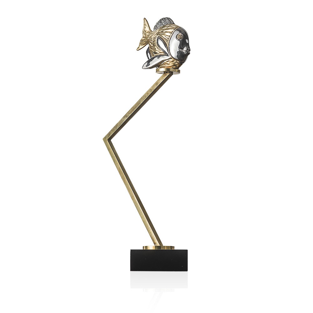 Small fish in pure gold plated majolica and platinum. Frame in natural brass and glossy black lacquered base.