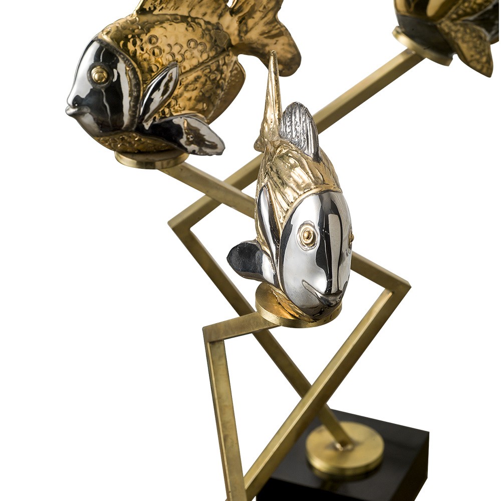 Small fish in pure gold plated majolica and platinum. Frame in natural brass and glossy black lacquered base.