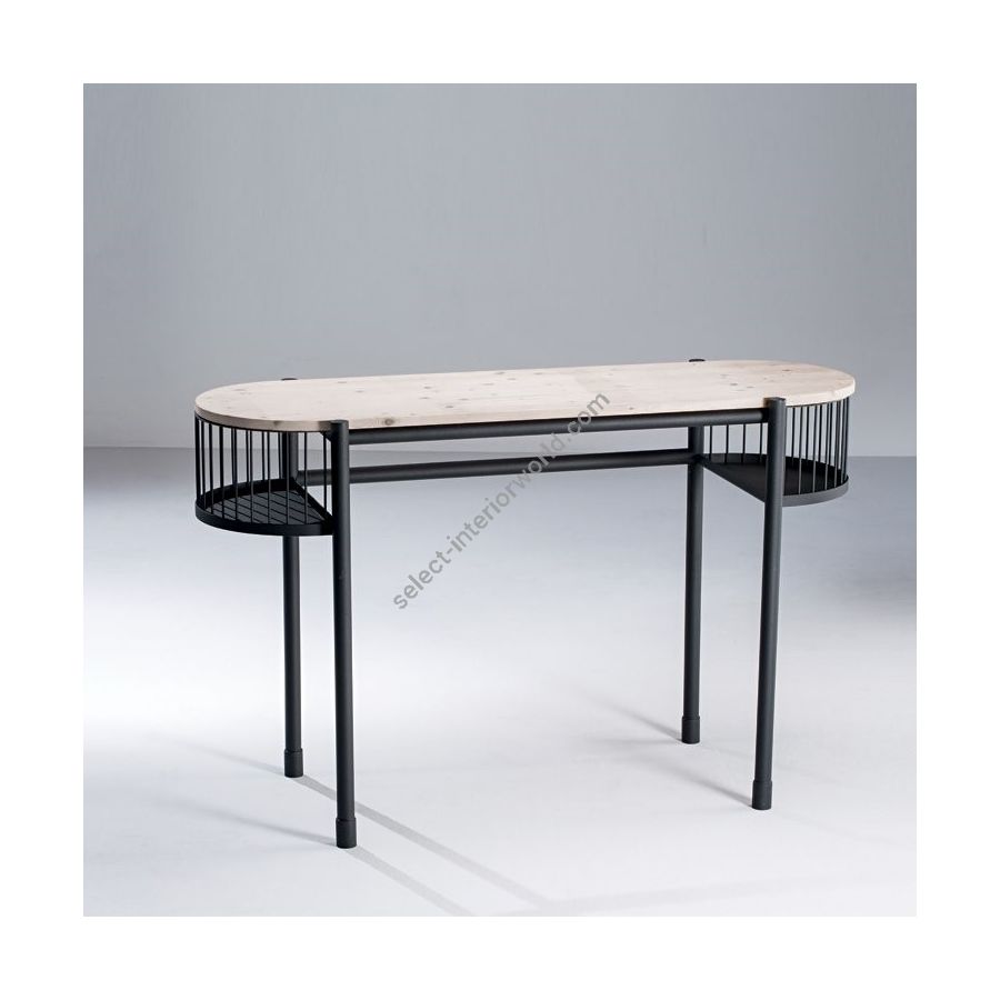 The étagère, with its elongated, symmetrical form, is designed with a large worktop or shelf, in accordance with the intended use, and is extended by two storage compartments below.