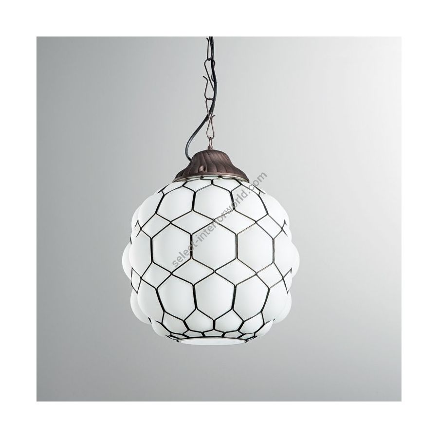 Giorgio Biscaro evokes distant and exotic atmospheres. Inspired by the forms of a turtle’s carapace, the Galapagos seems to come to life thanks to the movement of the blown glass caged in the latticework of precise and symmetrical metal lines that give form to the piece.