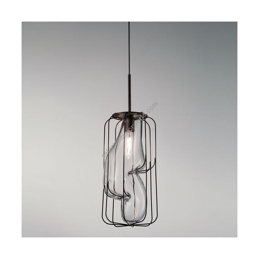 Blown glass meets in its path inside the cage of obstacles that force the development of an imperfect shape: the crystallization of the glass happens every time in a different way, developing