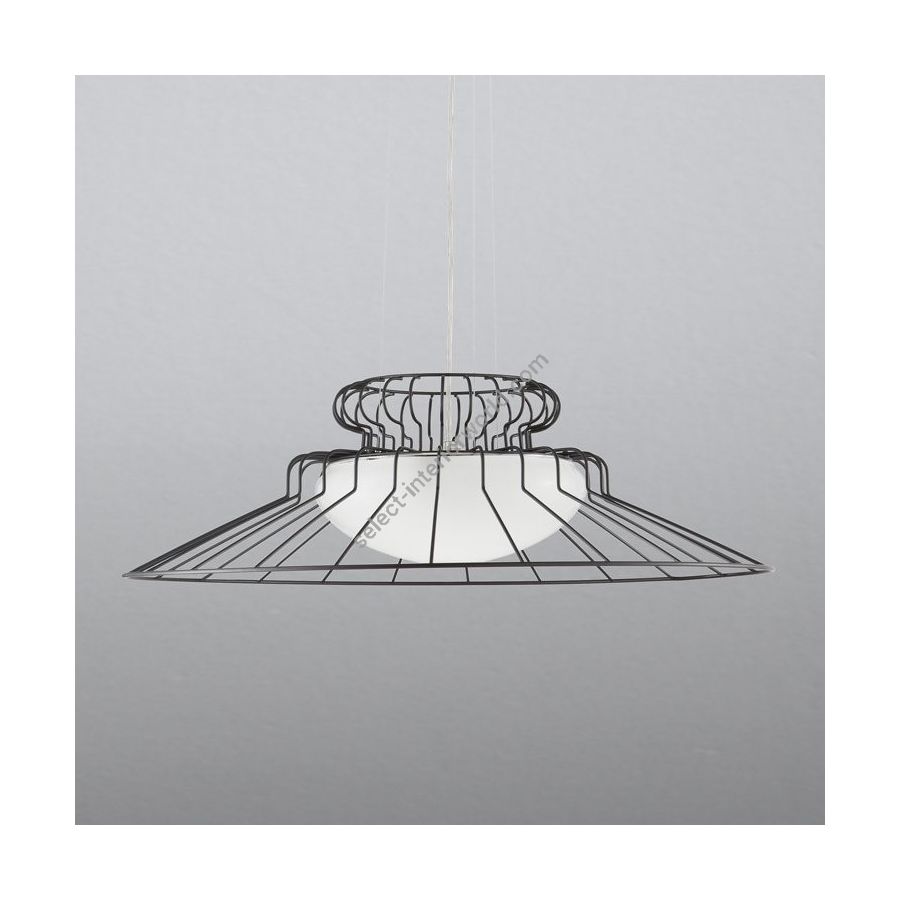 The compact diffuser inserted at the base of the cage flattens the volumes, extending outwards the metallic filaments that make up the lampshade.