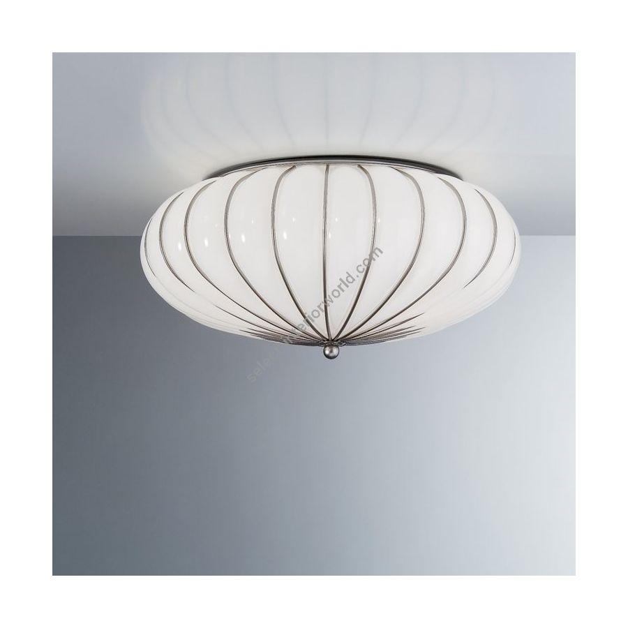 From the design clearly inspired by the classics of Venetian glass art, Giove is a stately light fixture, suited both to being a ceiling light and a sconce. The thick metal wires, arranged in a circular manner, outline the important and consistent aspect to render this piece suitable for any stylish residential or commercial environment.