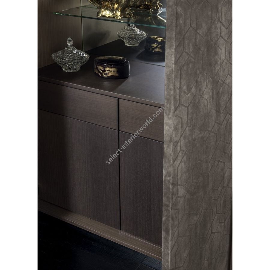 Bar unit fully covered in leather or cashmere from the Loro Piana Interiors catalogue. Dark stained zebrano wood internal finish, transparent glass shelves, lasered mirror with illuminated decoration, two drawers andan optional mini wine refrigerator. The 3D effect door covering with raised “Diamond” or “Sequence” decorationis only available in the P.3 Miami/SoftLeather/TecSuede range. Top surface finish: 5mm bronze orsmoky bevelled mirror. Ground metal base and edges in the following finishes: Satin nickel, bright shaded brown,Black Rose gold, bright light gold, matt Champagne gold, bright chrome, bright black chrome, matt satin bronze, bright pink gold, matt pink gold.