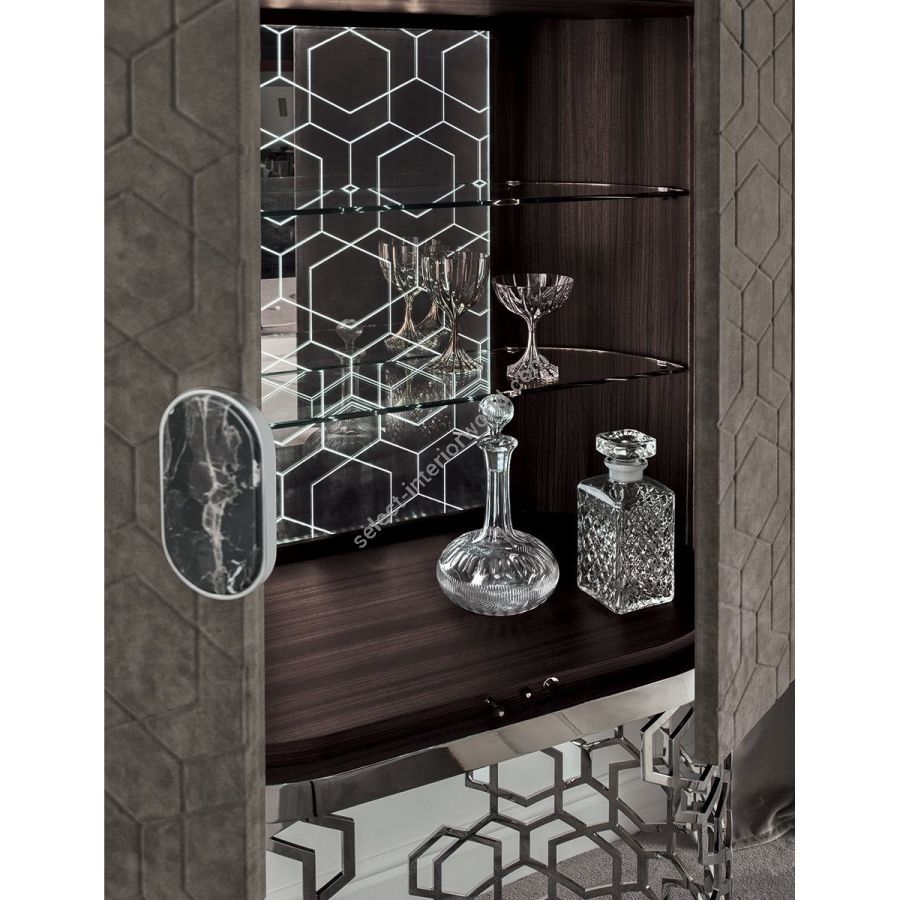 Minibar unit with ground metal base, laser cut with “Sequence” decoration and calendered. Base finish: Satin nickel, bright shaded brown, Black Rose gold, bright light gold, matt Champagne gold, bright chrome, bright black chrome, matt satin bronze, bright pink gold, matt pink gold. Bar unit fully coverd in leather or cashmere from the Loro Piana Interiors catalogue. Handle in marble from the range. Dark stained zebranowood internal finish, clear glass shelves, lasered mirror with illuminated decoration. The 3D effect door coveringwith raised “Diamond” or “Sequence” decoration is only available in the P.3 Cat. Miami/SoftLeather/Suede/TecSuede range. Top surface finish: 5mm bronze or smoky bevelled mirror.