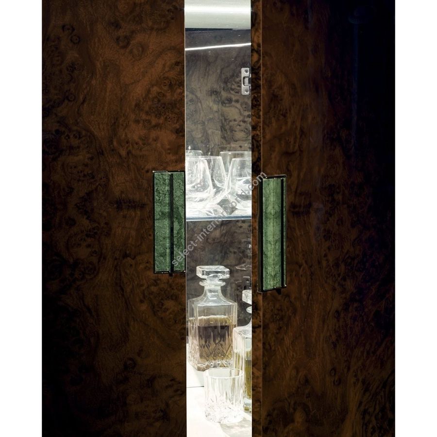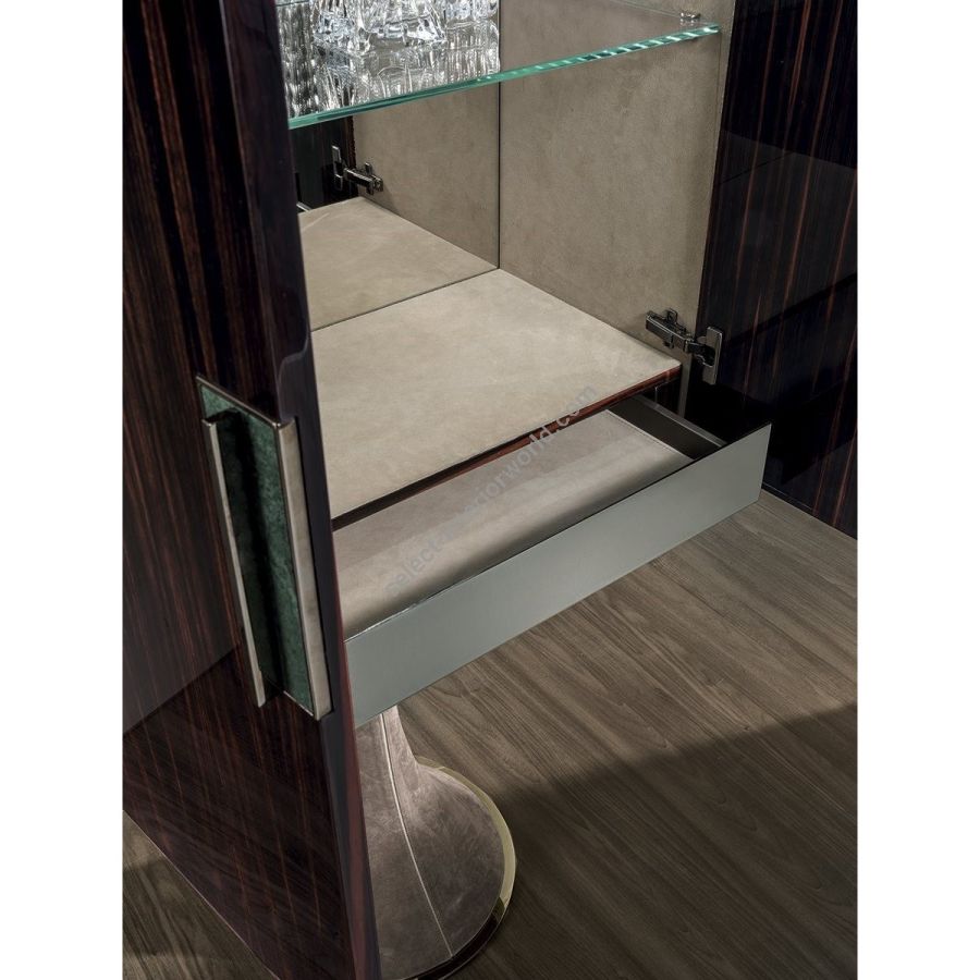 Series of cabinets with hyperboloid shaped base in glass fibre, with internal structure in painted metal, covered in range leathers. A/B - Cupboard in wood or leather: Wood cabinet: glossy/matt Maple, glossy/matt heat-treated Eucalyptus, glossy/matt ebony, glossy/matt Canaletto walnut, glossy/matt Sycamore frisè, glossy walnut burl wood.Doors in the same wood as the cabinet structure or covered in leather from the range. Interior covered incat. P.3 Miami/SoftLeather/Suede leather, the cabinet is outfitted with a drawer with metal front and a central shelf in transparent tempered glass 8mm. Rear in neutral mirror. Lighting with dimmable LED strip. A touch switch turns the light on. Handles in metal with insert in marble from the range. Edges and underbase plate in metal in the finishes: Satin nickel, bright shaded brown, Black Rose gold, bright light gold, matt Champagne gold, bright chrome, bright black chrome, matt satin bronze, bright pink gold, matt pink gold. 4 mm bronze or smoky mirror top with bevel. C - Display case: Cabinet with sides and door in tempered bronze or smoky glass (cabinet back in lacquered wood). The cabinet is outfitted with a central shelf in transparent tempered glass 8mm. Rear in neutral mirror. Lighting with dimmable LED strip. A touch switch turns the light on. Handles in metal with insert in marble from the range. Edges and underbase plate in metal in the finishes: Satin nickel, bright shaded brown, Black Rose gold, bright light gold, matt Champagne gold, bright chrome, bright black chrome, matt satin bronze, bright pink gold, matt pink gold. 4 mm bronze or smoky mirror top with bevel.