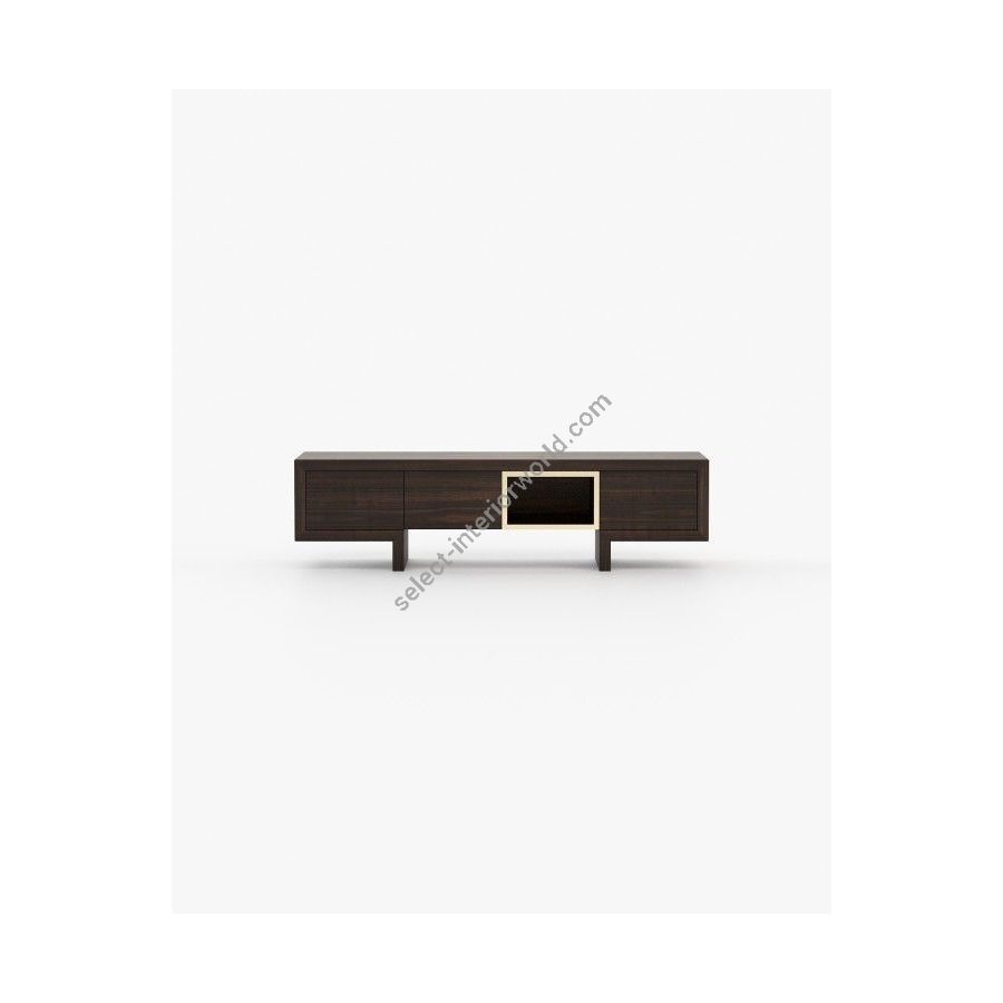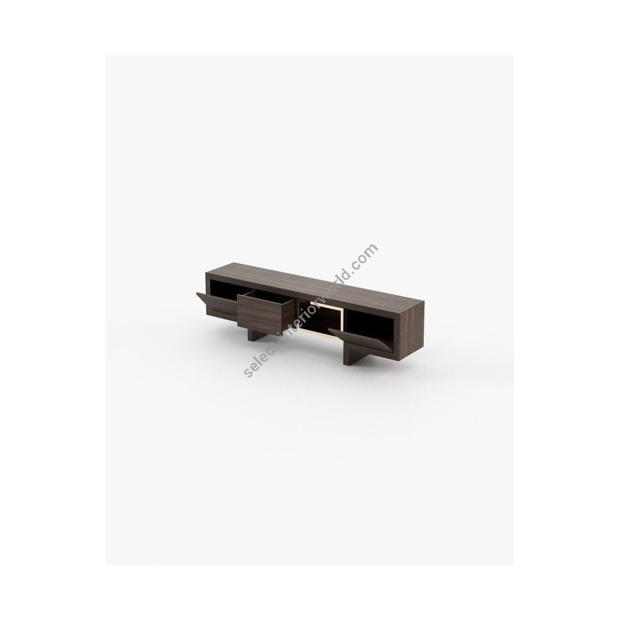 The Isis TV cabinet is a modern piece inspired by contemporary decor trends, handmade by Laskasas artisans and featuring a sleek silhouette with three doors in walnut veneer and a shelf with golden details.