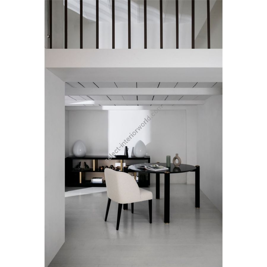 The Sloane bookcase is available in gloss or mat lacquered in a wide color range or in gloss or mat makassar ebony veneered. The metal dividers are available in gloss brass, gloss chrome, bronze, satin brass, pewter or cloudy bronze.| Dimensions (HxWxD): | cm: 75x212x40 / inch: 29.53"x83.46"x15.75" |