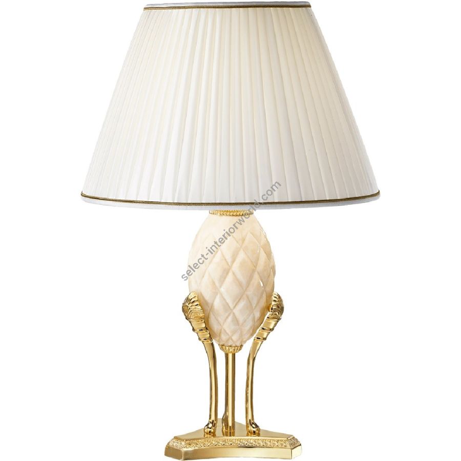 Important Table lamp with carved white alabaster and ivory-colored plissé silk lampshade. Base and details in pure gold finish brass.