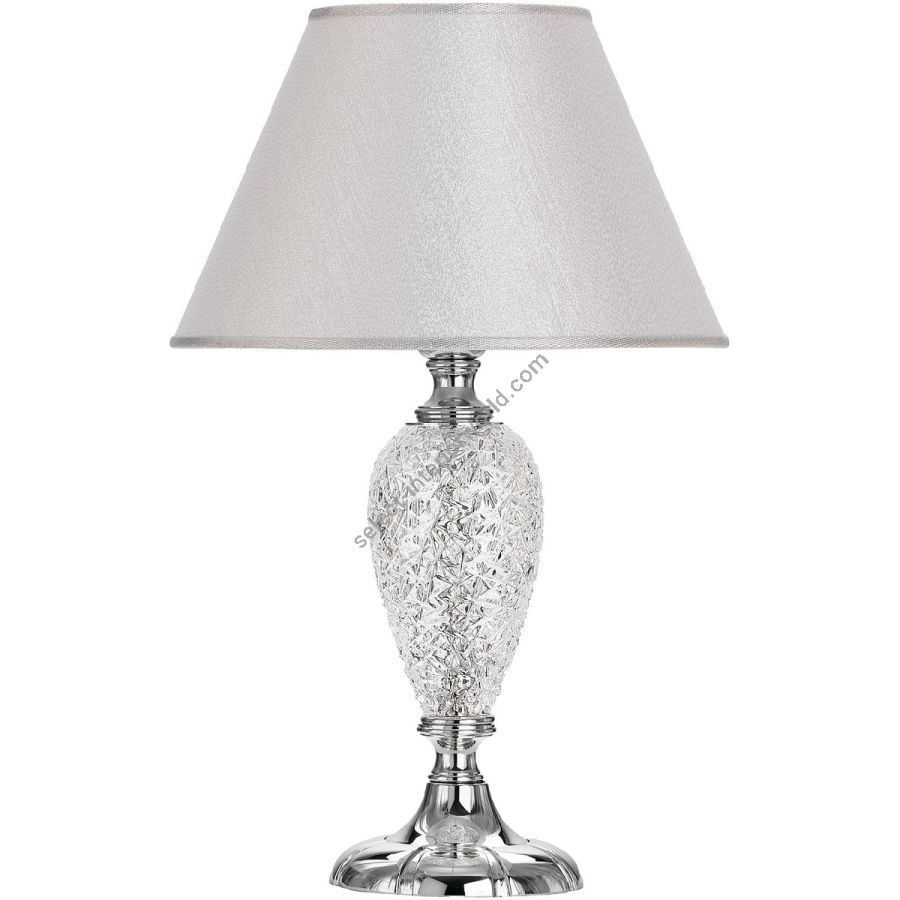 More elegant and luxurious version of the Raffaello collection, made of brass as well, but in a chrome finish. The panels are in hand-cut transparent crystal. The table lamp with a refined silver lamé lampshade completes the collection. Possibility to customize the finishes.
