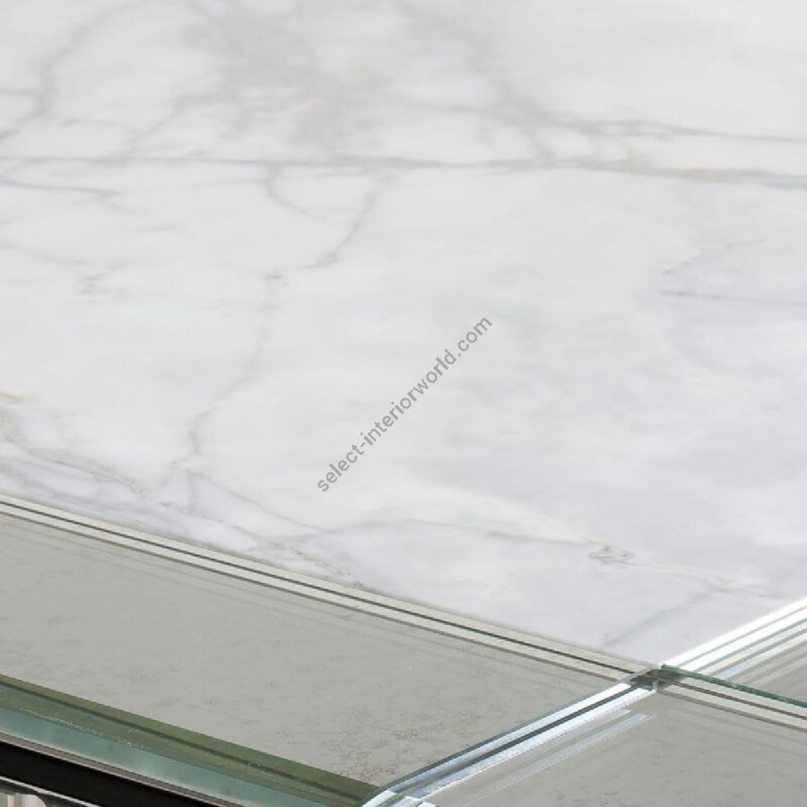 White Calacatta marble top. Frames and legs made of bevelled and engraved glass with clear mirror finish.