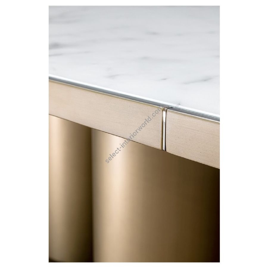 Dining table with base composed by six cylinders in satin Brass finish. Wooden top in matching finish with 40mm thick edge and with Marmoreflex inlay. Bespoke dimension: 500 x 120 x 75h cm