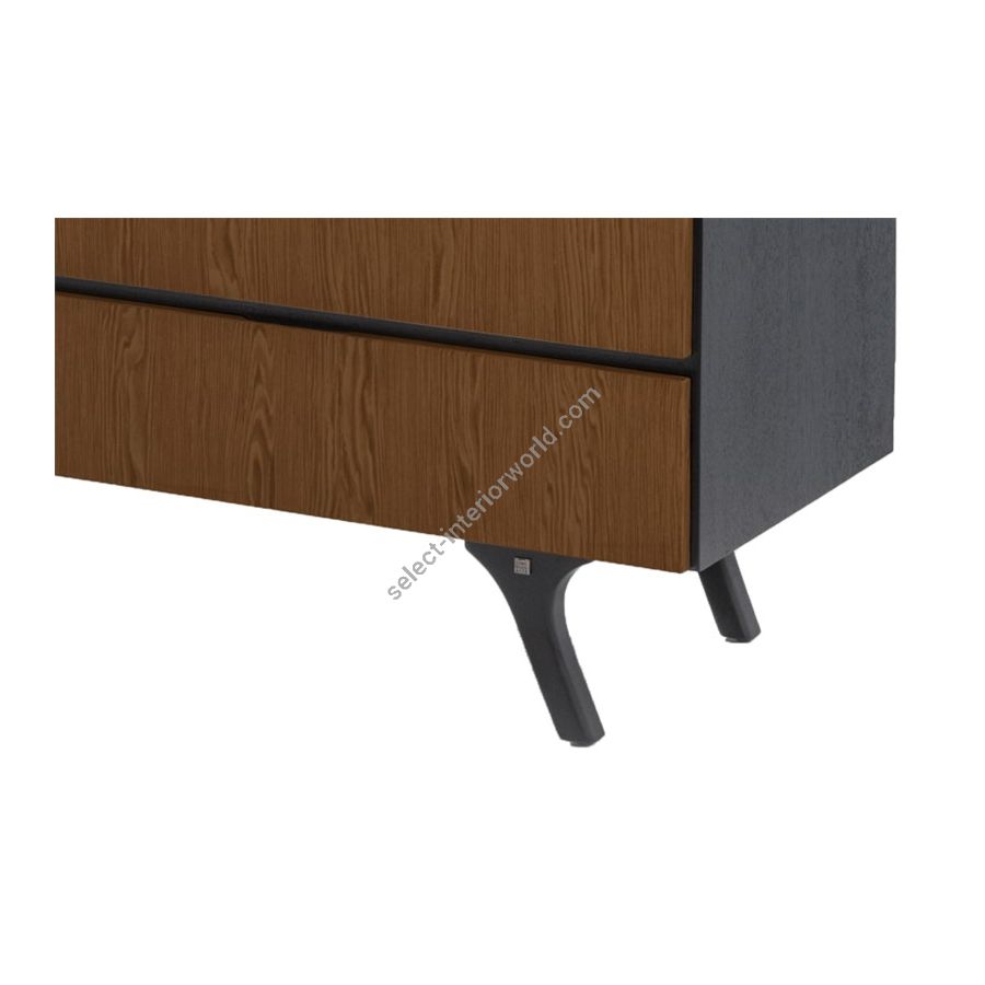 Comfortable, versatile, modern and light weight. A wonderful reinterpretation of the style from the sixties. Latte Wood drawer fronts, from the six drawers, the upper ones include the characteristic hardware from this collection; three well produced leather pads in its base and a sculptural form with small legs that make you think it is floating in space.
