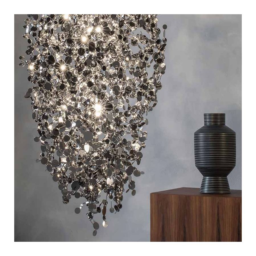 With this new suspension light, designer Dodo Arslan creates a shimmering, silver cloud. Argent consists of metal discs that have been meticulously joined by hand by Terzani craftsmen into clusters. Once lit, the multiple, angled surfaces of the discs emanate a soft, shimmering, white glow.