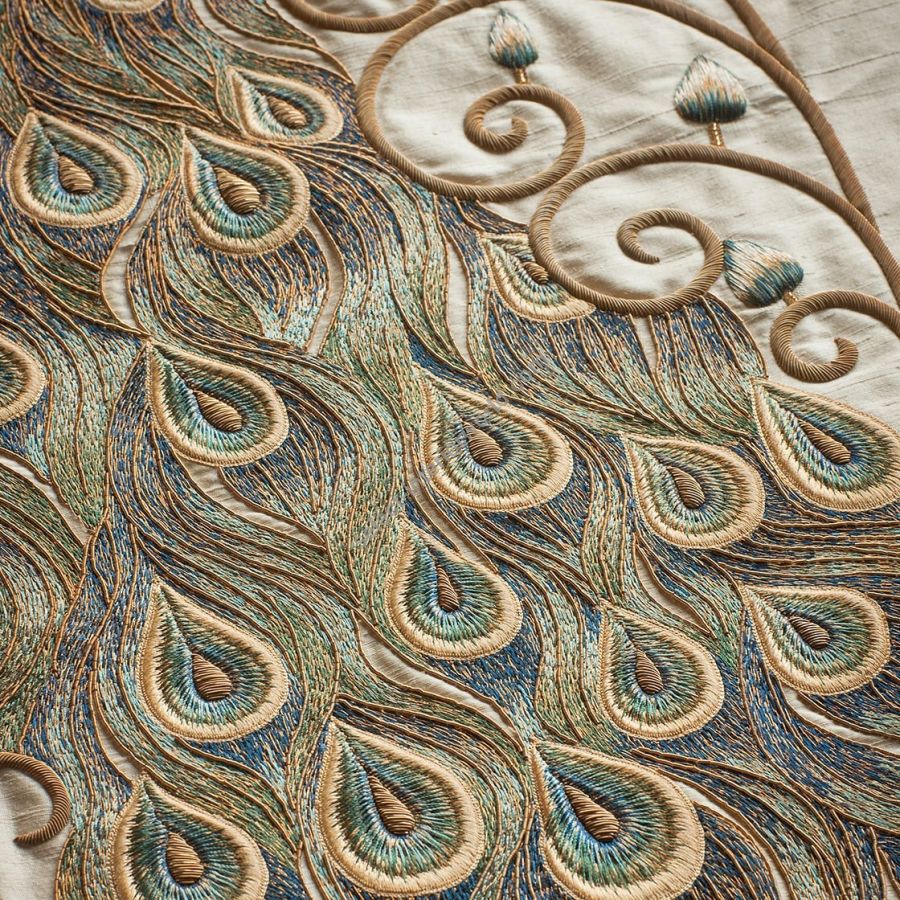 Juno is a marvellously dramatic panel combining the exotic plumage of peacocks with a beautifully worked scrolling design in gold thread.