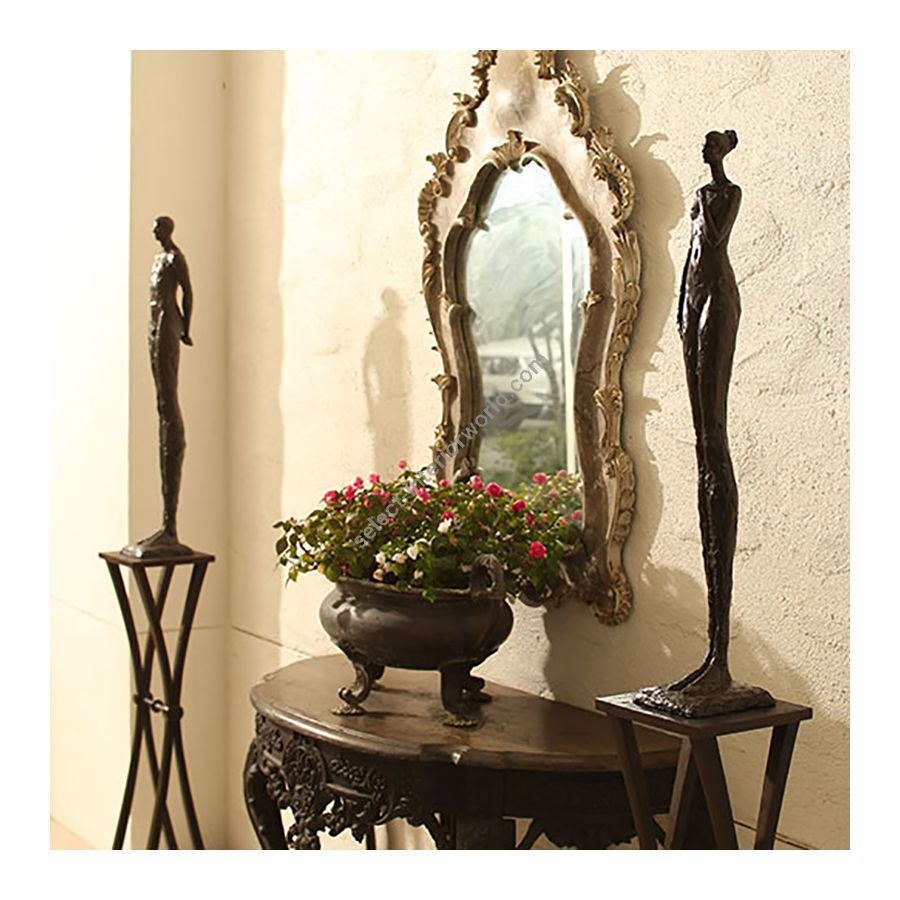 The tall sculpture Female Reveal II by Tom Corbin is made of bronze.