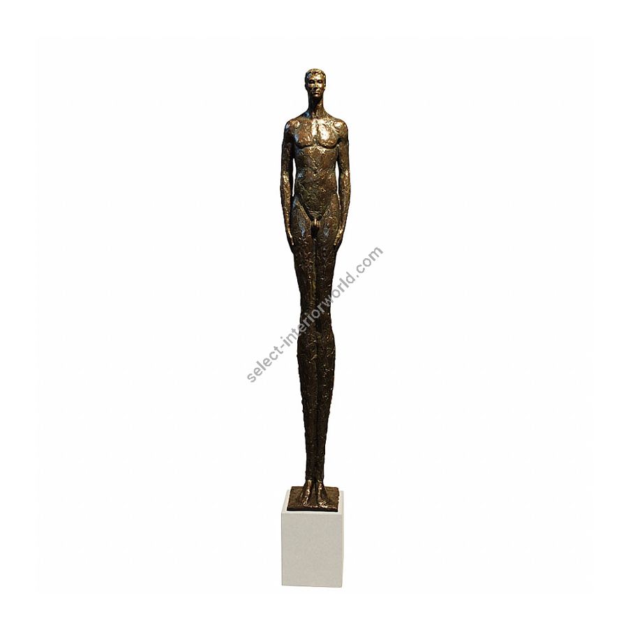 The tall sculpture Renaissance Man by Tom Corbin is made of bronze with cast stone base.