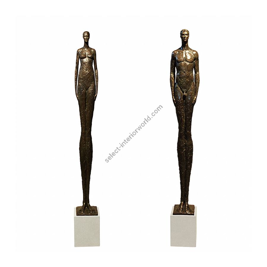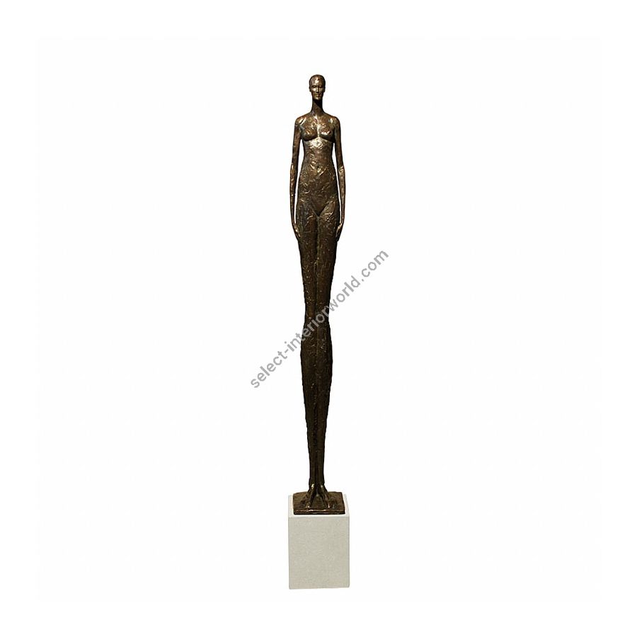 The tall sculpture Renaissance Woman by Tom Corbin is made of bronze with cast stone base.