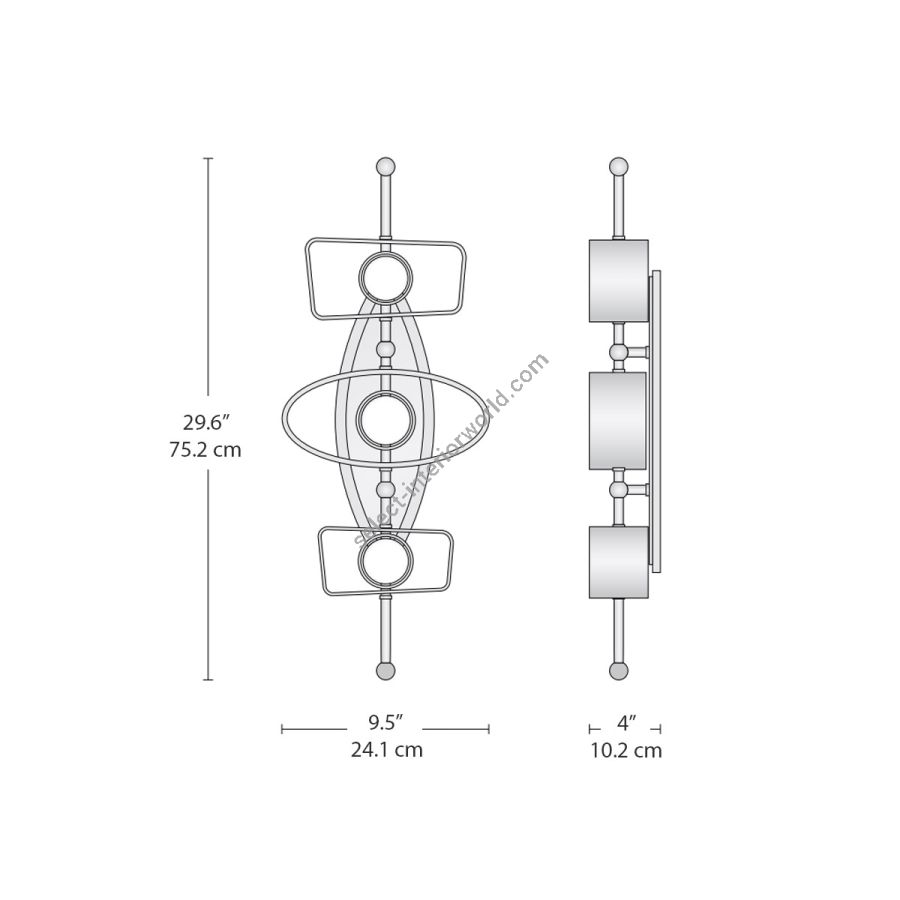 Using rich metal and improvements in lighting technology, Totem re-imagines designs from the 1950s and hearkens back to early American modernism. It features three stacked forms (a large oval between two smaller trapezoids) threaded on a vertical arm which is mounted on a diamond-shaped backplate. In the center of each cast form is a round acrylic orb that conceals an LED lamp.