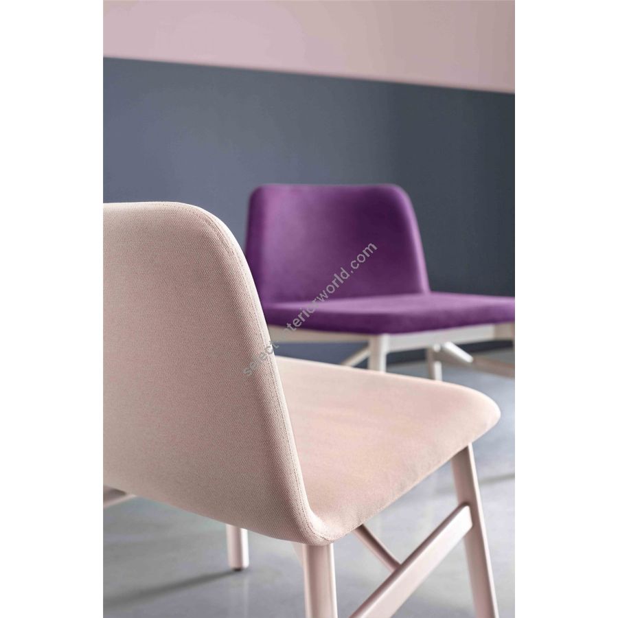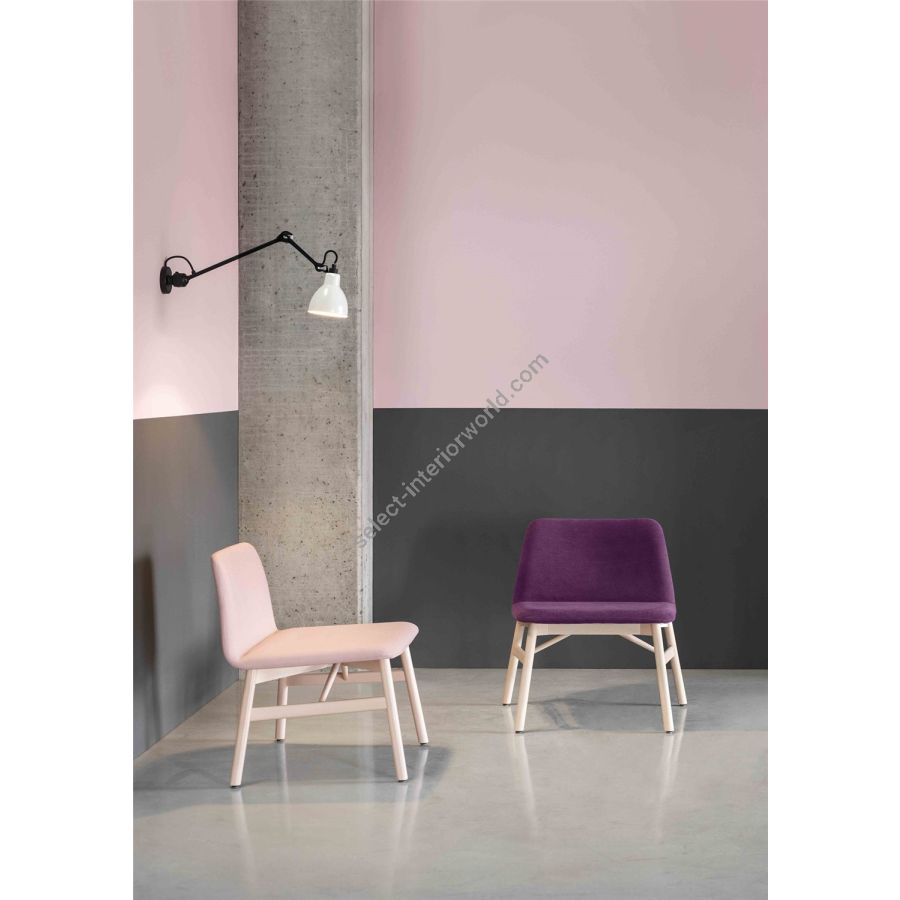 Available in a wide range of upholsteries, including fire-retardant fabrics, wool, velvet, leather and faux leather, Bardot is the ideal choice both at home - in the kitchen, dining room or study - and in public spaces. The rounded wooden legs of the stool and of the armchair with padded armrests echo the soft lines of the original Bardot chair.