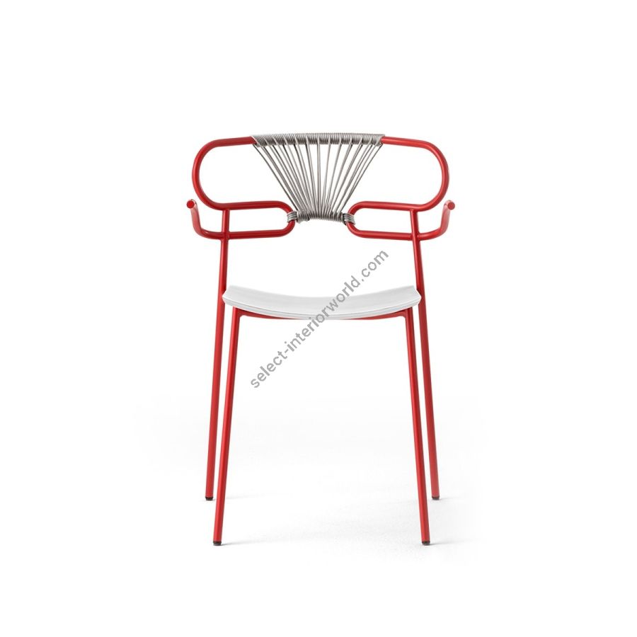 The outdoor version of the chair will be presented at Salone del Mobile 2019. With integral body in polyurethane, mass painted in the mould, it is also available with a woven backrest in coloured rope to enhance both its look and the level of comfort provided. The frame in powder-coated tubular metal comes in a wide variety of colours; the slightly curved seat - for the indoor versions - is in ash wood (left au naturel or painted) or upholstered with various fabrics, leather or eco-leather.