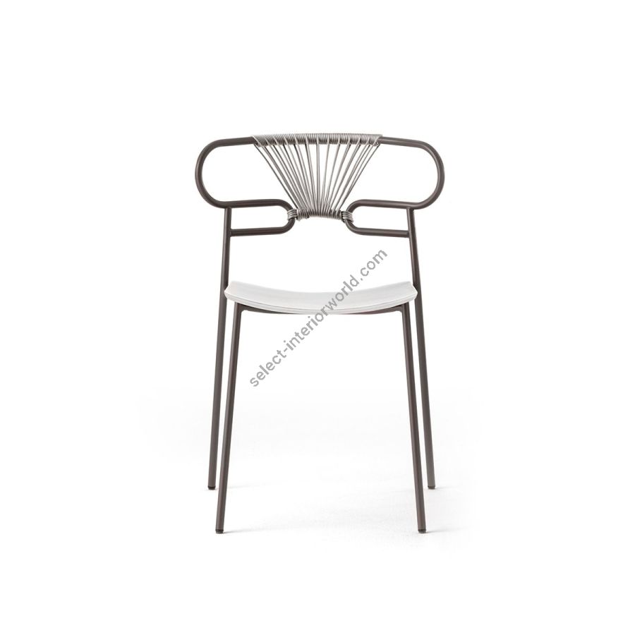The outdoor version of the chair will be presented at Salone del Mobile 2019. With integral body in polyurethane, mass painted in the mould, it is also available with a woven backrest in coloured rope to enhance both its look and the level of comfort provided. The frame in powder-coated tubular metal comes in a wide variety of colours; the slightly curved seat - for the indoor versions - is in ash wood (left au naturel or painted) or upholstered with various fabrics, leather or eco-leather.
