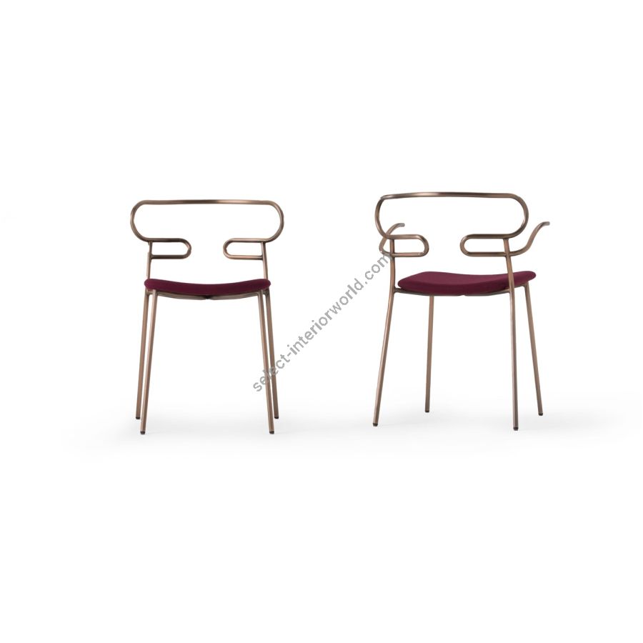 The characterizing element is the 'one line' backrest, obtained from the curvature of a single metal tube which - with its virtually infinite sinuous line, extended into this new version in the armrests - fits discreetly into any space, connoting it with lightness. At the Salone del Mobile 2019 the outdoor version of the seats is presented - with a body in integral polyurethane painted in the mass and in the mold - also available with a backrest woven with colored rope, which enhances, in addition to aesthetics, the level of comfort.