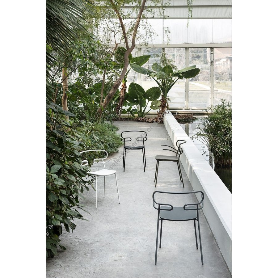The outdoor version of the chair will be presented at Salone del Mobile 2019. With integral body in polyurethane, mass painted in the mould, it is also available with a woven backrest in coloured rope to enhance both its look and the level of comfort provided.The frame in powder-coated tubular metal comes in a wide variety of colours; the slightly curved seat - for the indoor versions - is in ash wood (left au naturel or painted) or upholstered with various fabrics, leather or eco-leather.