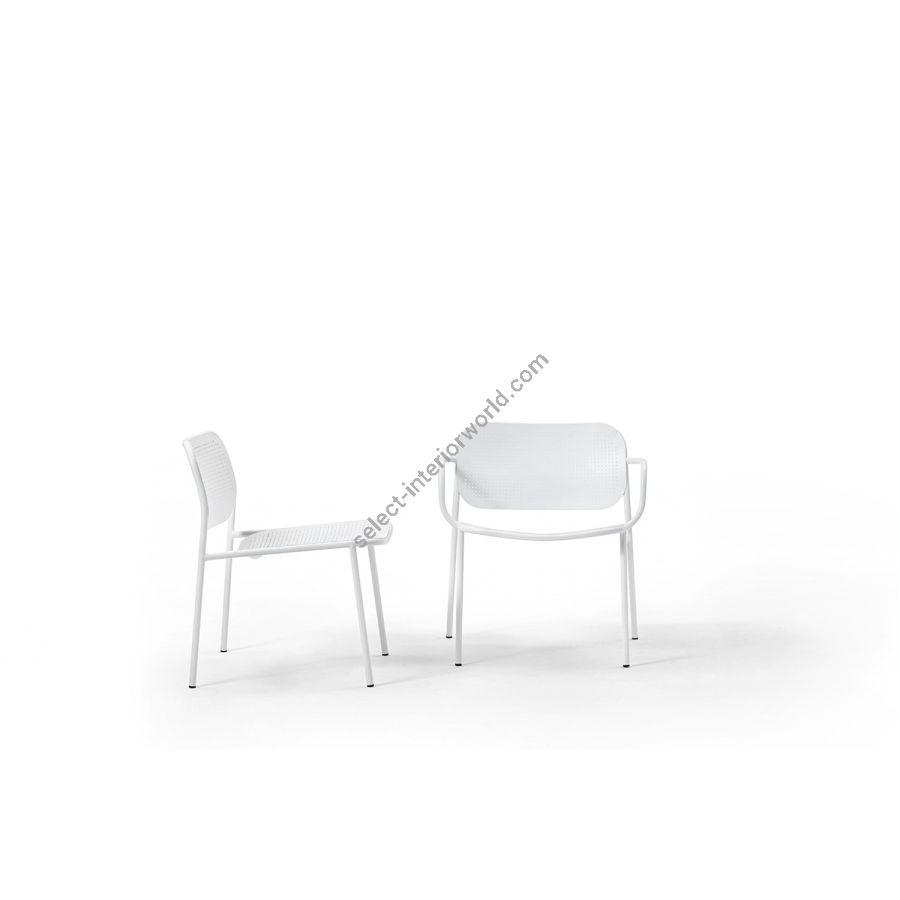 The collection includes the chair with or without armrests, the lounge version with or without armrest and the stool in two heights. In all versions, the tubular metal frame is complementedby curved, sheet metal backrests and seats with a decorative hole pattern that is a modern interpretation of the classic Viennese weave.