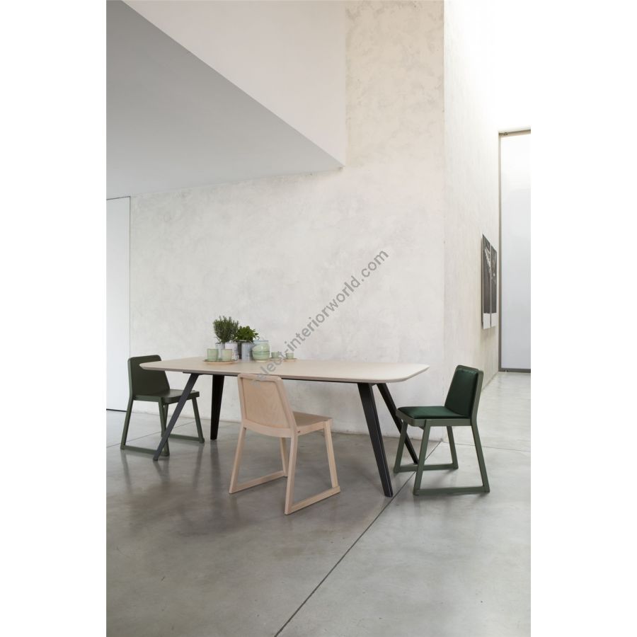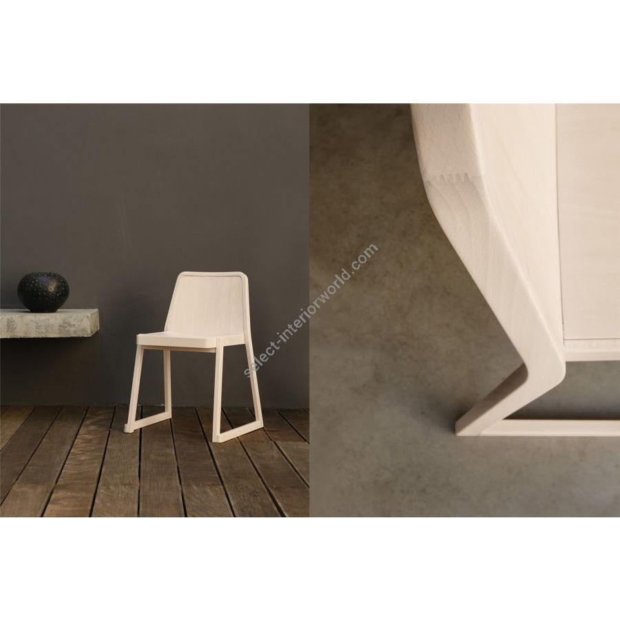 The frame, seat and backrest are in beech, either bleached, natural or lacquered in a very wide range of shades. The seat and backrest are padded and upholstered in fabric, velvet, leather, faux leather, or flame retardant Trevira textiles.