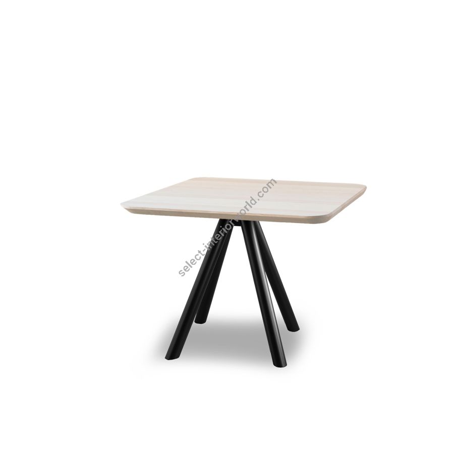 Two new solutions for the AKY table collection, which is enhanced by a tête à tête variant: you can choose between a square or round top, for intimate breakfasts in public environments or to personalise small living spaces. AKY is supported by legs with central meeting point available in wood, combining solid and fluid shapes, or metal, to provide the table with both ascending tension and lightness.