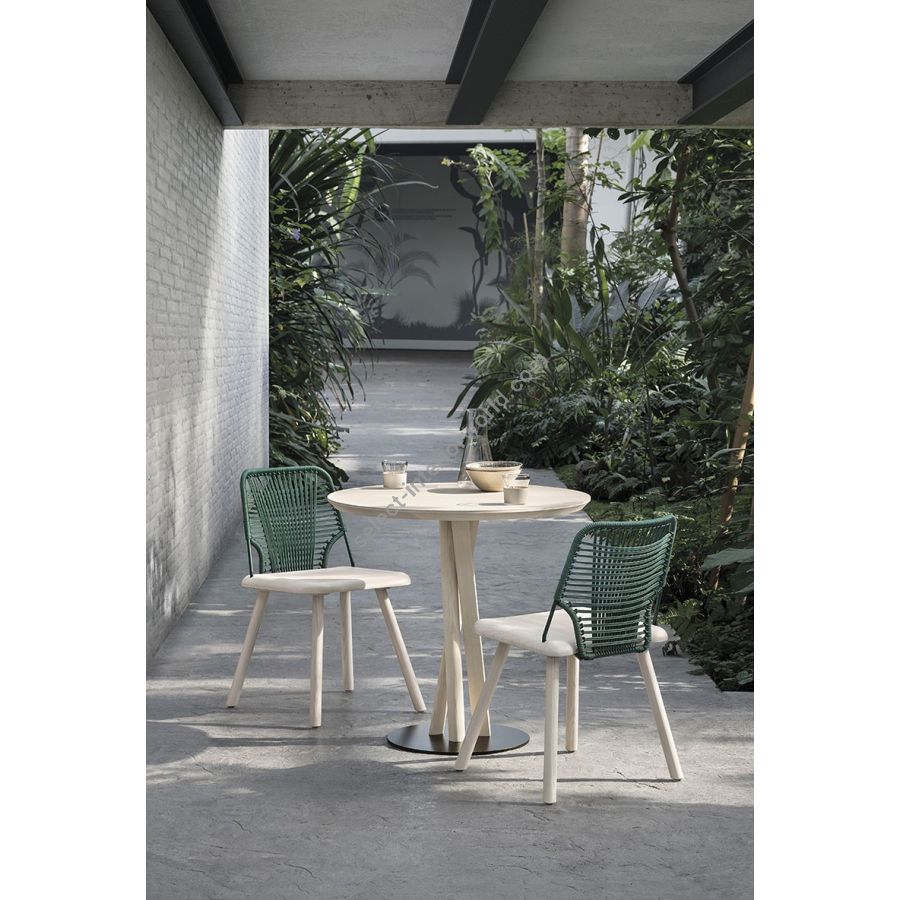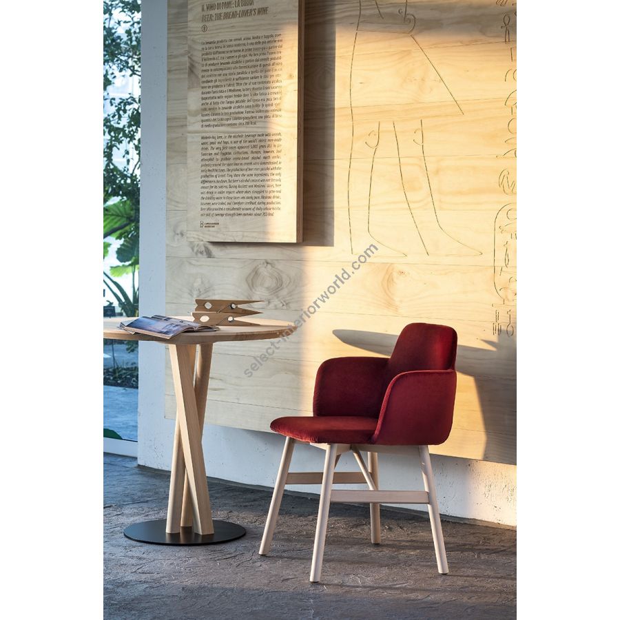 The deconstructed frame, obtained by intersecting a round, an oval and a square leg, calls to mind the recycling of materials from different industrial processes. The tables' colour range and strong personality make these products easy to mix and match with any Trabà product.