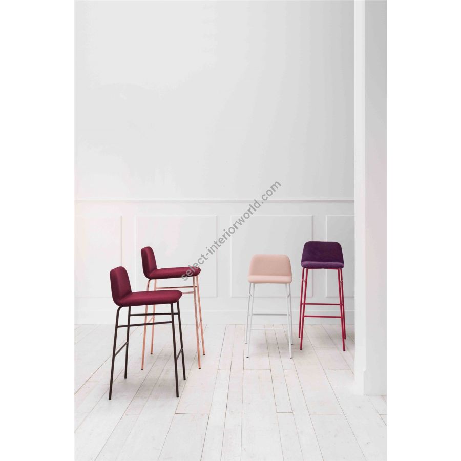 A wide range of colors for the upholstery, upholstered in velvet, or leather or eco-leather, makes it suitable for both the home, kitchen, dining room, study, and contract environments. A transversal proposal to create welcoming domestic settings or furnish contract spaces. The Bardot family expands and is enriched by a stool with 4-leg metal structure and footrests alongside an accommodating and round seat.