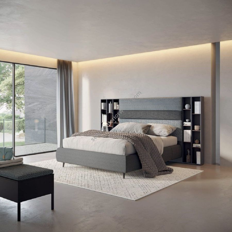 The bed is composed by a modular headboard with open boxes, textile pads and panels which can be equipped with hanging and modular elements in height and width.
