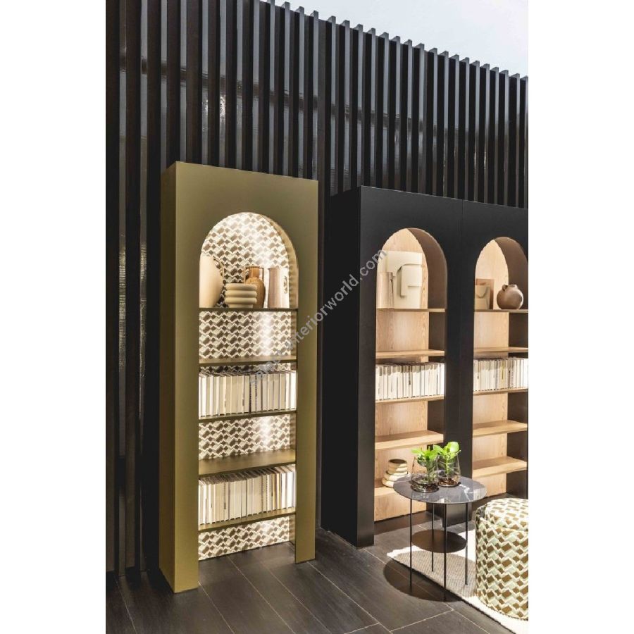 Arco bookcase is composed of single elements characterized by niches following arch portal lines. This ones are juxtaposed in order to compose a shelving system and to create a series of consequential arches. A concealed internal light system gives to the bookcase even more personality and depth. Arco can be customized by mixing finishes for back and structure, to create different color and material combinations, which can be adapted to any environment and style. Thanks to its modularity, this system can be endlessly expanded